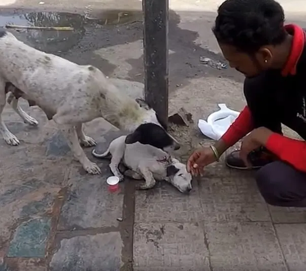 Seeing the rescuer’s gentle touch, the mother dog realized he meant no harm. Trust began to bloom, and she quietly stepped aside, allowing him to care for her injured puppy.