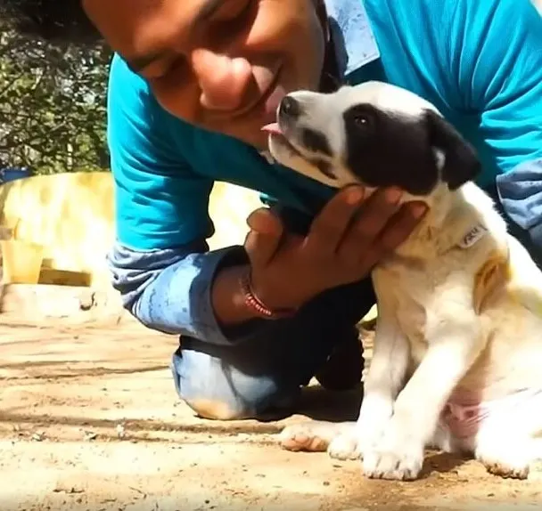 With utmost care, the rescuer scooped the crying pup into his arms and carried him toward the car.