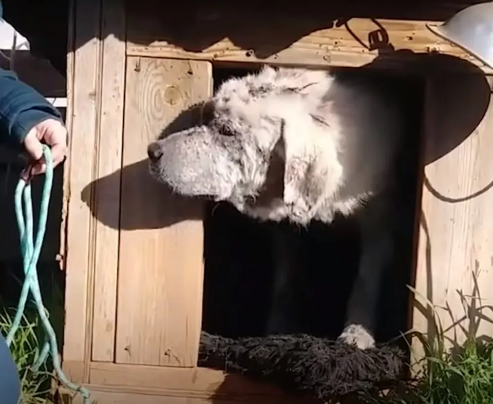 But after eating, Bo retreated into his doghouse and refused to come out. The rescuers soon realized they would have to gently pull him out to help him.