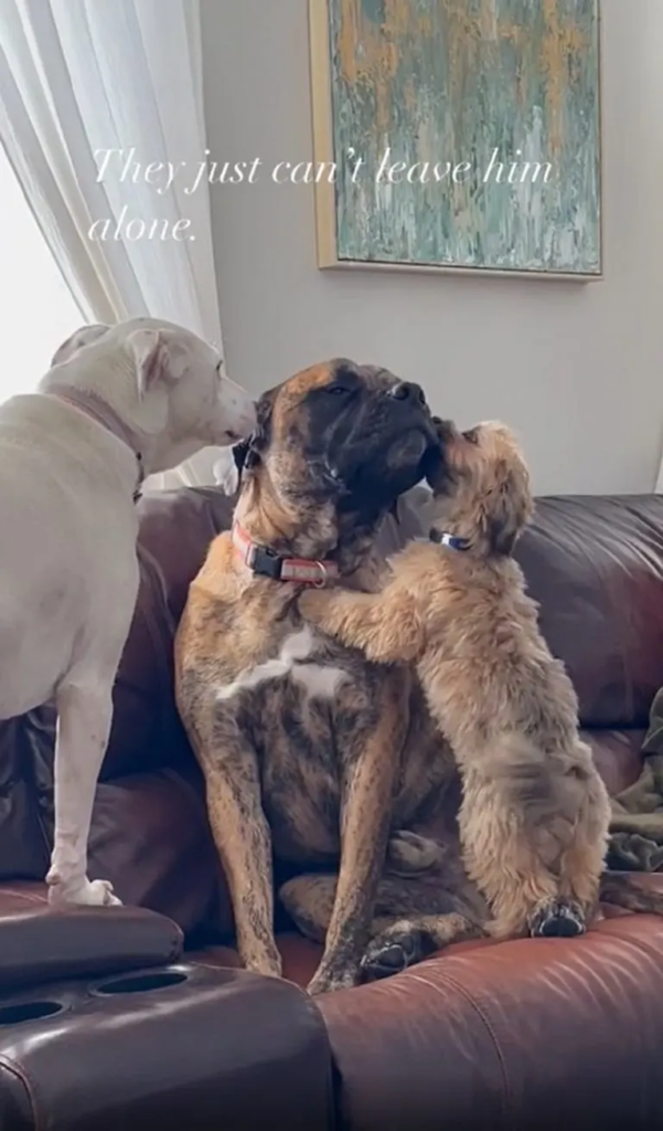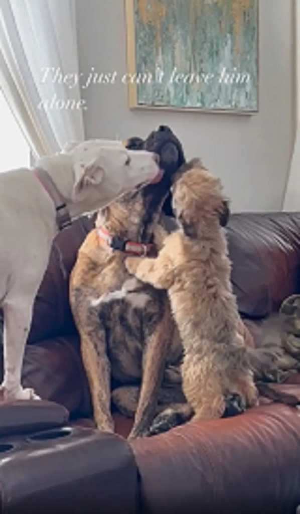 In the video, it’s clear that Rex’s two dog siblings absolutely adore him. Whenever they sense his anxiety, they rush to his side, offering comfort with affectionate kisses.