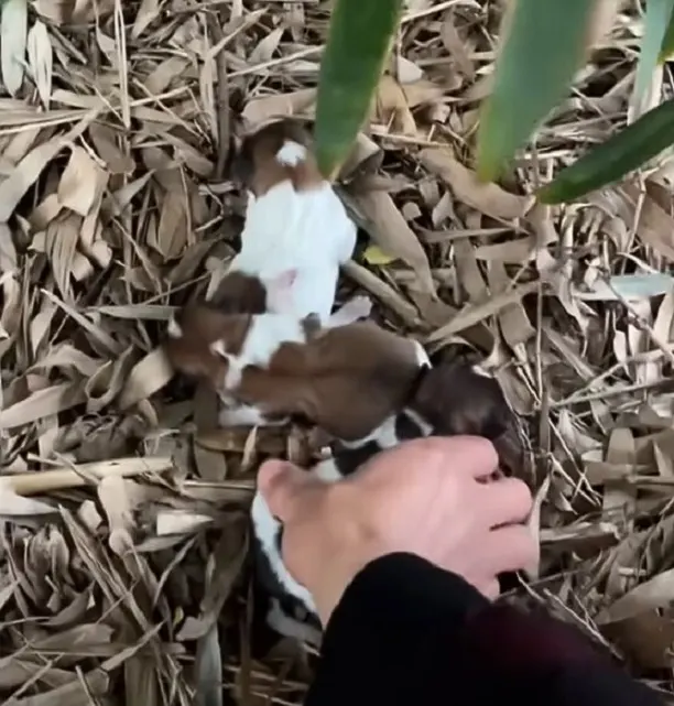 Following the sound, he came upon four tiny newborn puppies, crying helplessly. His heart sank at the sight.